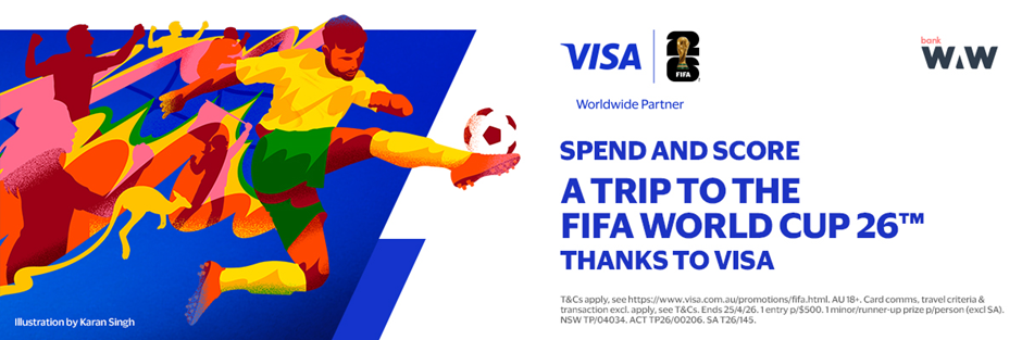 T&Cs apply, see https://www.visa.com.au/promotions/fifa.html. AU res 18+. Cardholder, communications & travel criteria & transaction exclusions apply, see terms. Ends 11:59pm AEST 25/4/26. 1 entry p/$500 spent. 1 minor/runner‑up prize p/person (excl SA). NSW TP/04034. ACT TP26/00206. SA T26/145.